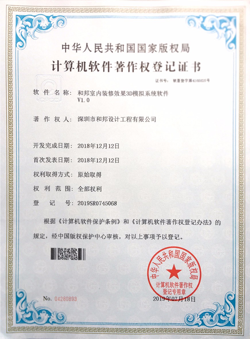 根據《中華人民共和國計算機軟件保護條例》和《計算機軟件著作權登記辦法》的規定,經中華人民共和國國家版權局審定,我公司自主研發的7款軟件被正式授予《中華人民共和國國家版權局計算機軟件著作權登記證書》,7款軟件分別為:“和邦別墅裝修效果智能優化系統V1.0”、“和邦室內辦公環境空間模擬規劃系統軟件V1.0”、“和邦別墅裝飾色彩搭配設計模擬軟件V1.0”、“和邦室內裝修效果3D模擬系統軟件V1.0”、“和邦精裝樣板房設計三維模擬系統V1.0”、“和邦別墅室內采光效果智能分析系統V1.0”、“和邦園林式別墅格局規劃設計系統軟件V1.0”。